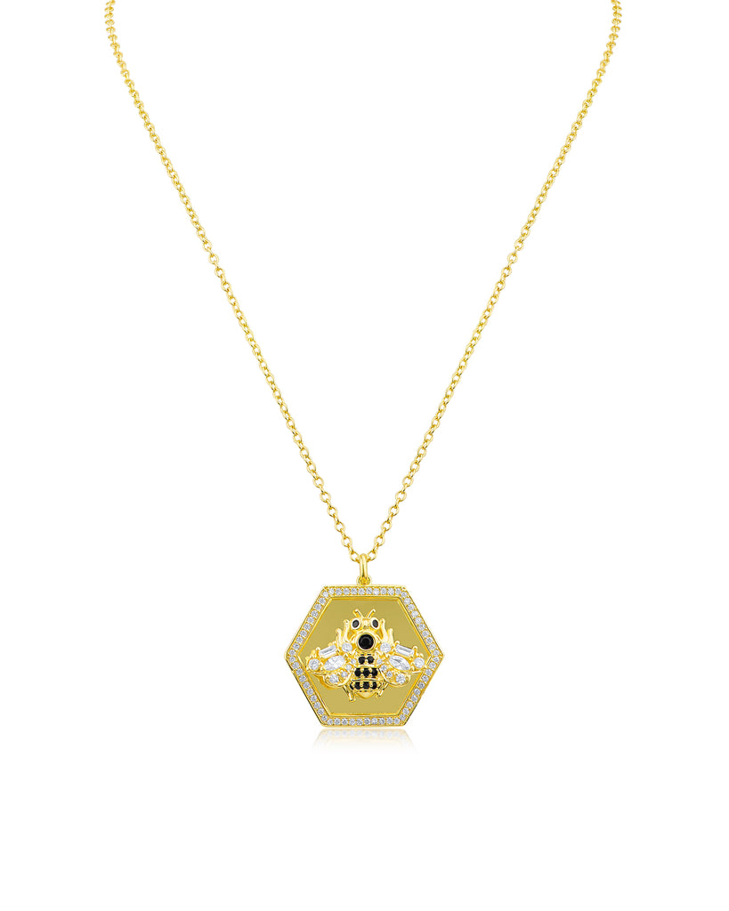 A gold-plated brass hexagon pendant featuring a dazzling bee design at the center, adorned with 4 carats total weight of pavé cubic zirconia stones for a sparkling finish.
