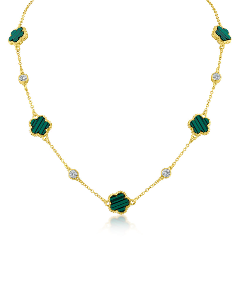 Get noticed with this stunning 18" necklace featuring a 4 cttw round CZ charm and a delicate clover station, all set in high-quality gold plated brass. Add a touch of elegance and sparkle to any outfit with this must-have accessory.