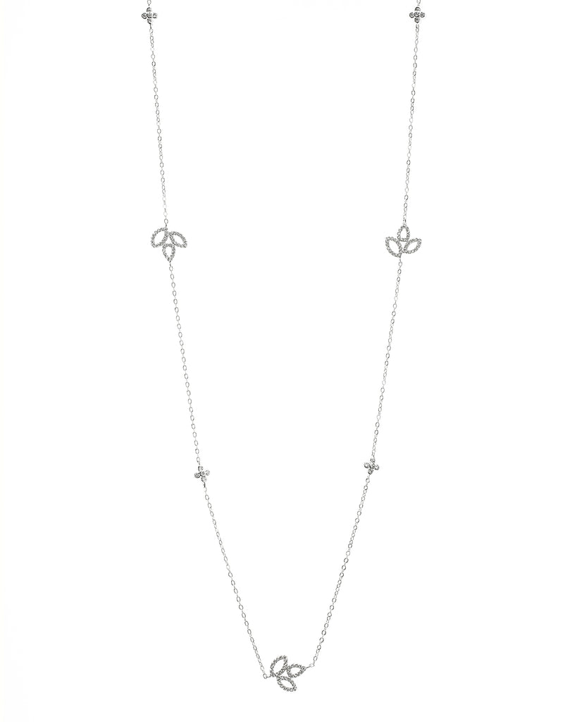 Elevate your everyday style with this stunning 36" station necklace, featuring delicate pave lily charms spaced along a graceful chain. Choose between sophisticated rhodium plating or warm gold plating on durable brass for a luxurious look that complements any wardrobe. The perfect balance of elegance and versatility.