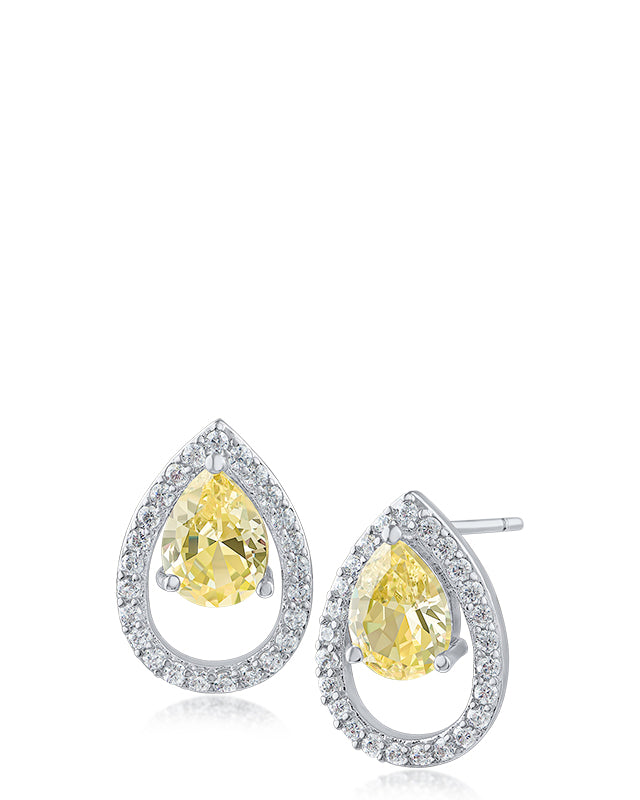 Indulge in the exquisite brilliance of these 4 cttw Pear CZ stud earrings with a dazzling pave halo. The rhodium plated brass setting adds a touch of sophistication to this stunning piece.