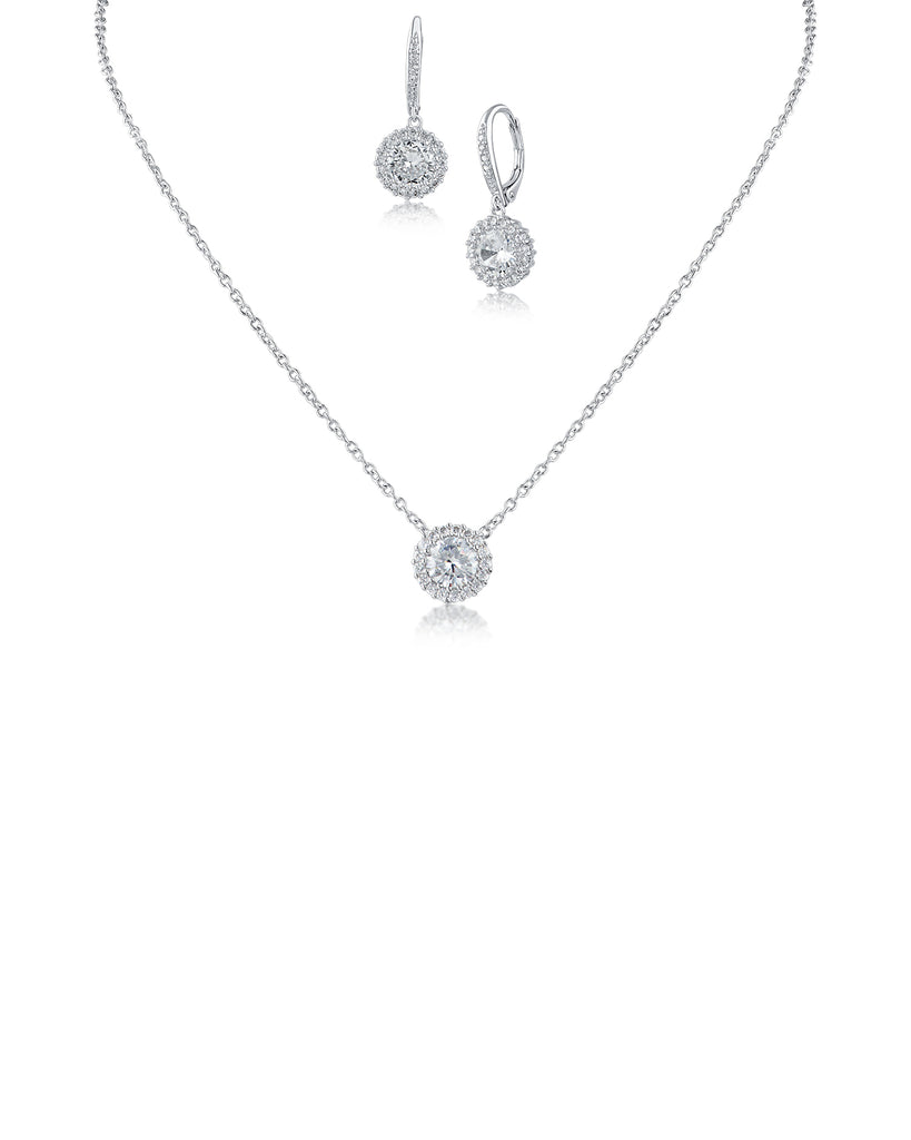 Discover the 8 cttw Round Cubic Zirconia Pendant and Round Halo Earring Set! Glimmering with pave halo trim, set in beautiful rhodium plated brass. This exquisite gift box set is perfect for giving or keeping!