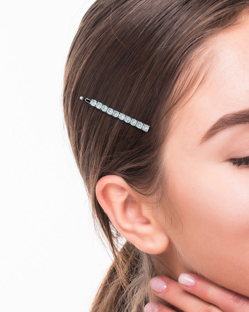 4 CTTW Round Cubic Zirconia hair pin. Set of 2. Set in rhodium plated brass.